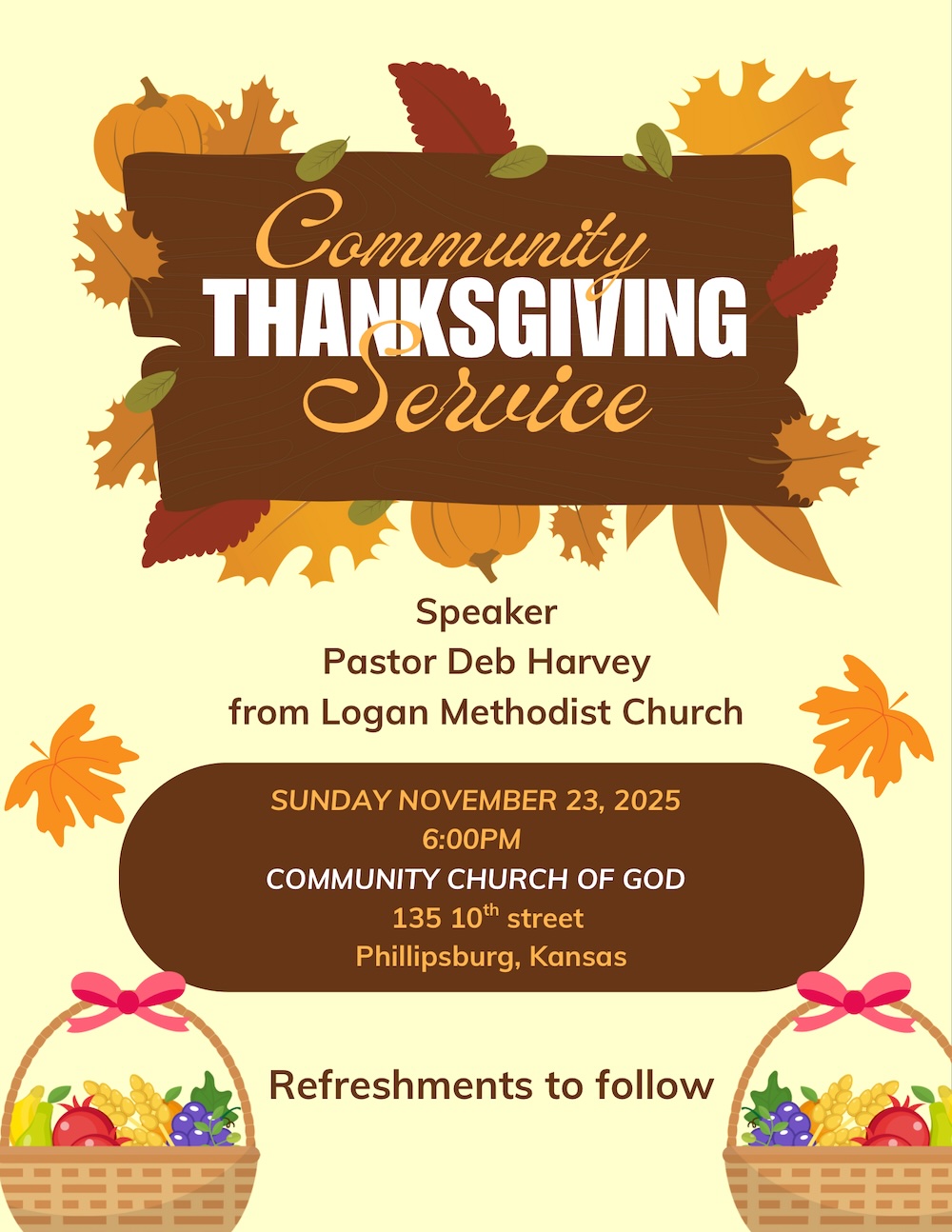 The entire community is invited to come to the Community Church of God for a Thanksgiving Service on Sunday, November 23 at 6pm. Deb Harvey from the Logan Methodist Church will be speaking. Refreshments to follow.