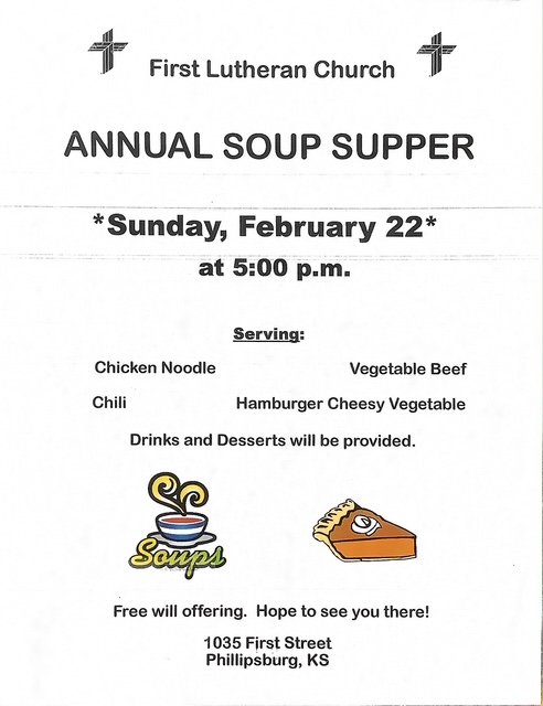 The First Lutheran Church Annual Soup Supper will be held Sunday, February 22, beginning at 5pm. A variety of soups (chicken noodle, chili, vegetable beef, and hamburger cheesy vegetable) and desserts will be served. A free will offering will be taken, and the public is invited. The church is located at 1035 First Street in Phillipsburg.