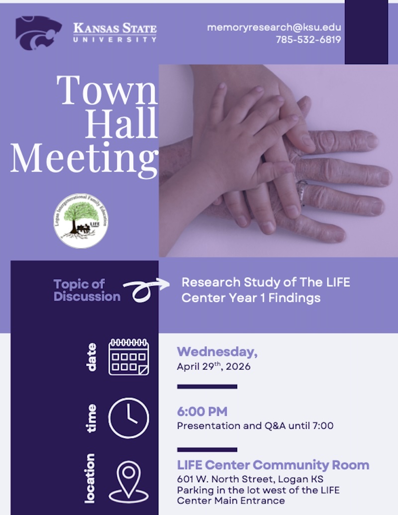 Come to hear a presentation about research findings on year one of The Life Center in Logan, Kansas. There is also an opportunity for questions and answers. This town hall meeting takes place on April 29th at 6pm at the Life Center in Logan.