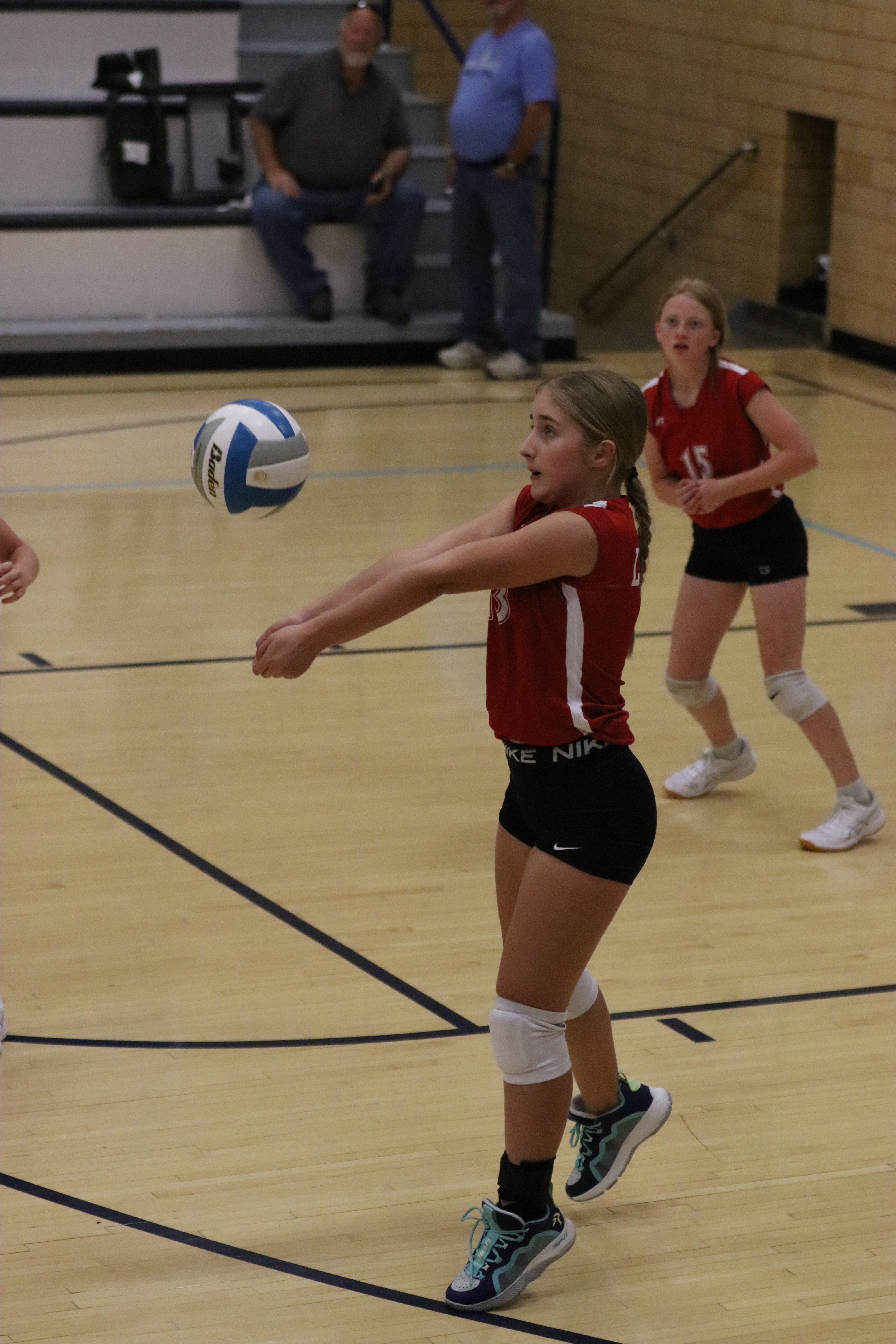 7th grader Kylah Brumbaugh passes the ball to the setter. Photos by Kristi VanDerVeen.