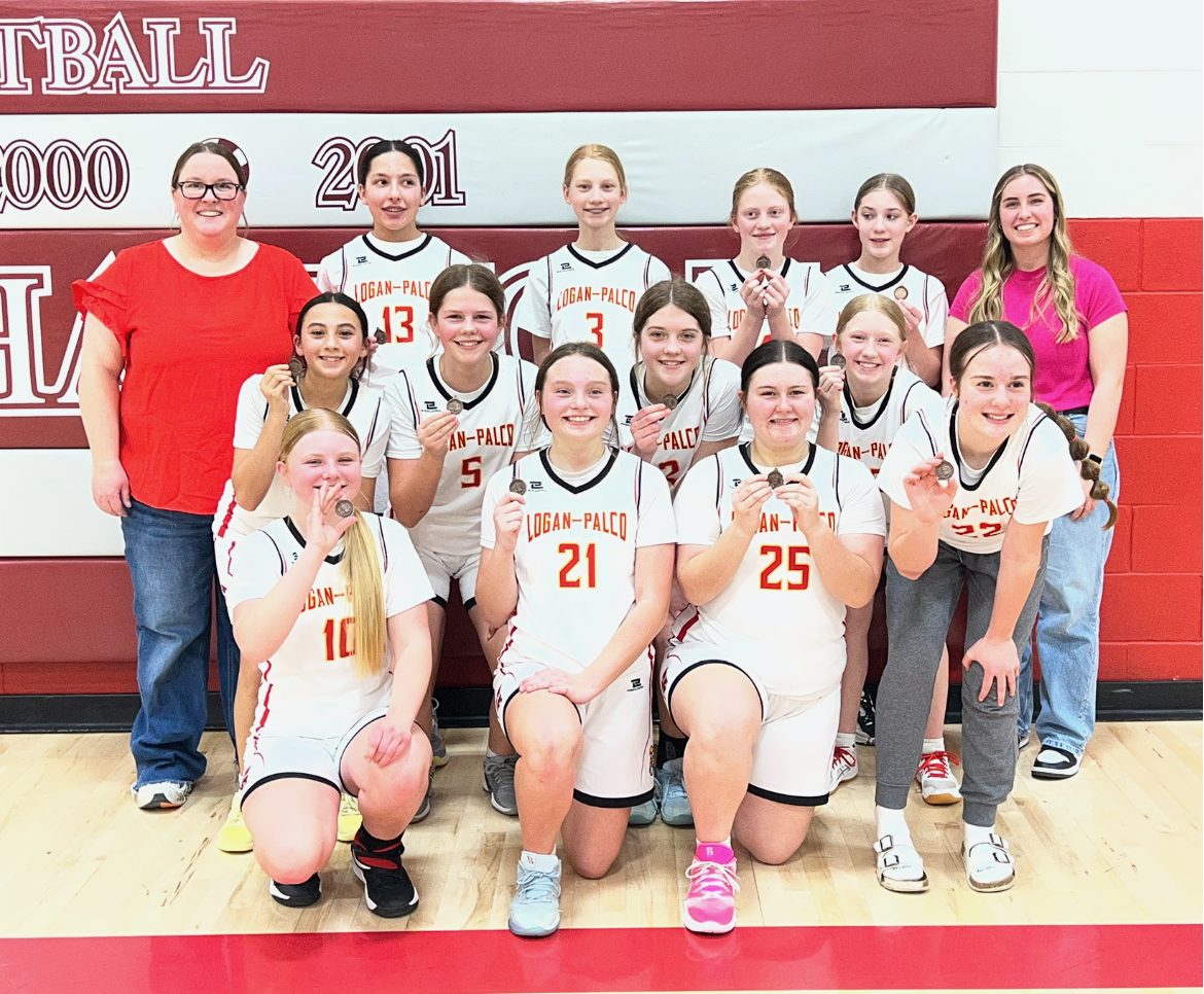 Logan-Palco girls 3rd place in the WKLL tournament: (First row) Kinley VanDerVeen, Annslee Traxler, Payson Morford and Graysen Becker; (second row) Harper Vahling, Jensen Hogan, Harper Delimont and Zoe Tien; (third row) head coach Kim Ellenberger, Ha